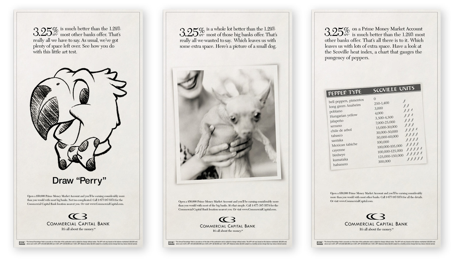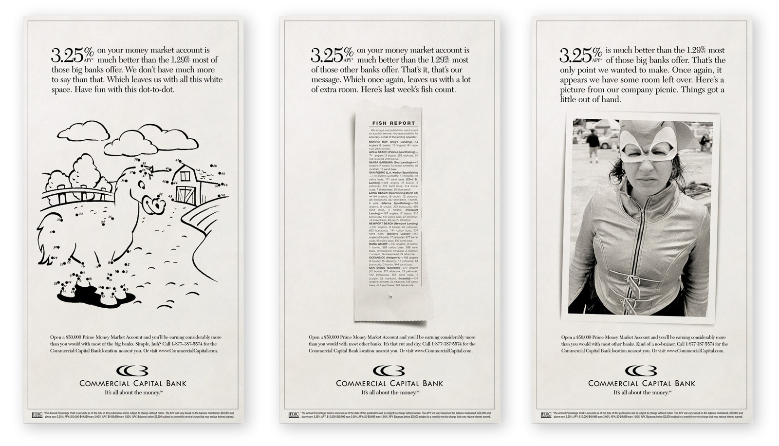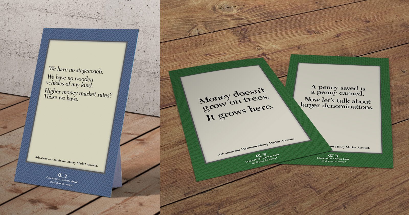 In the banking business, it's all about the rate, especially for investment products. The solution—list the rate, then make the ad stand out from the clutter. This campaign ran in in the local branches and OC business publications with the goal of raising capital quickly. It was so successful that the campaign was pulled early.