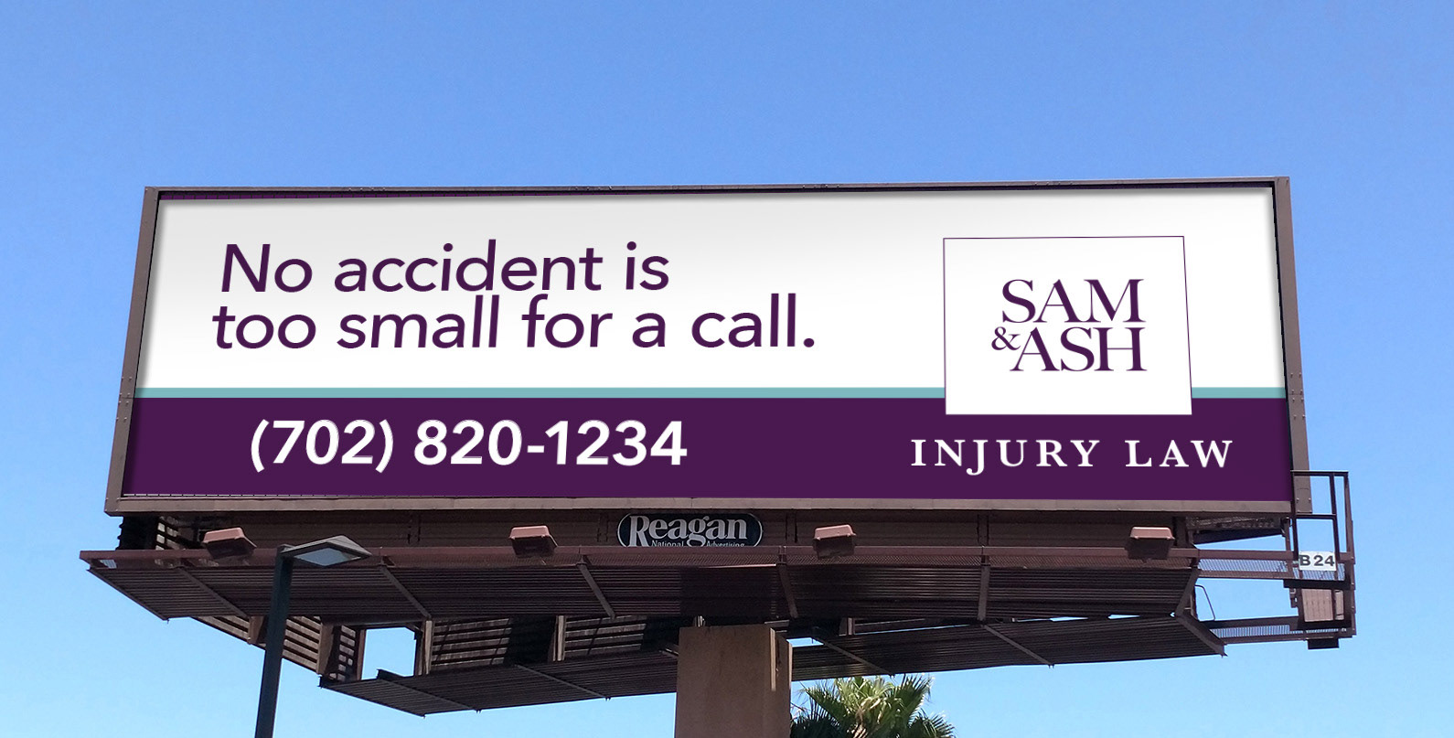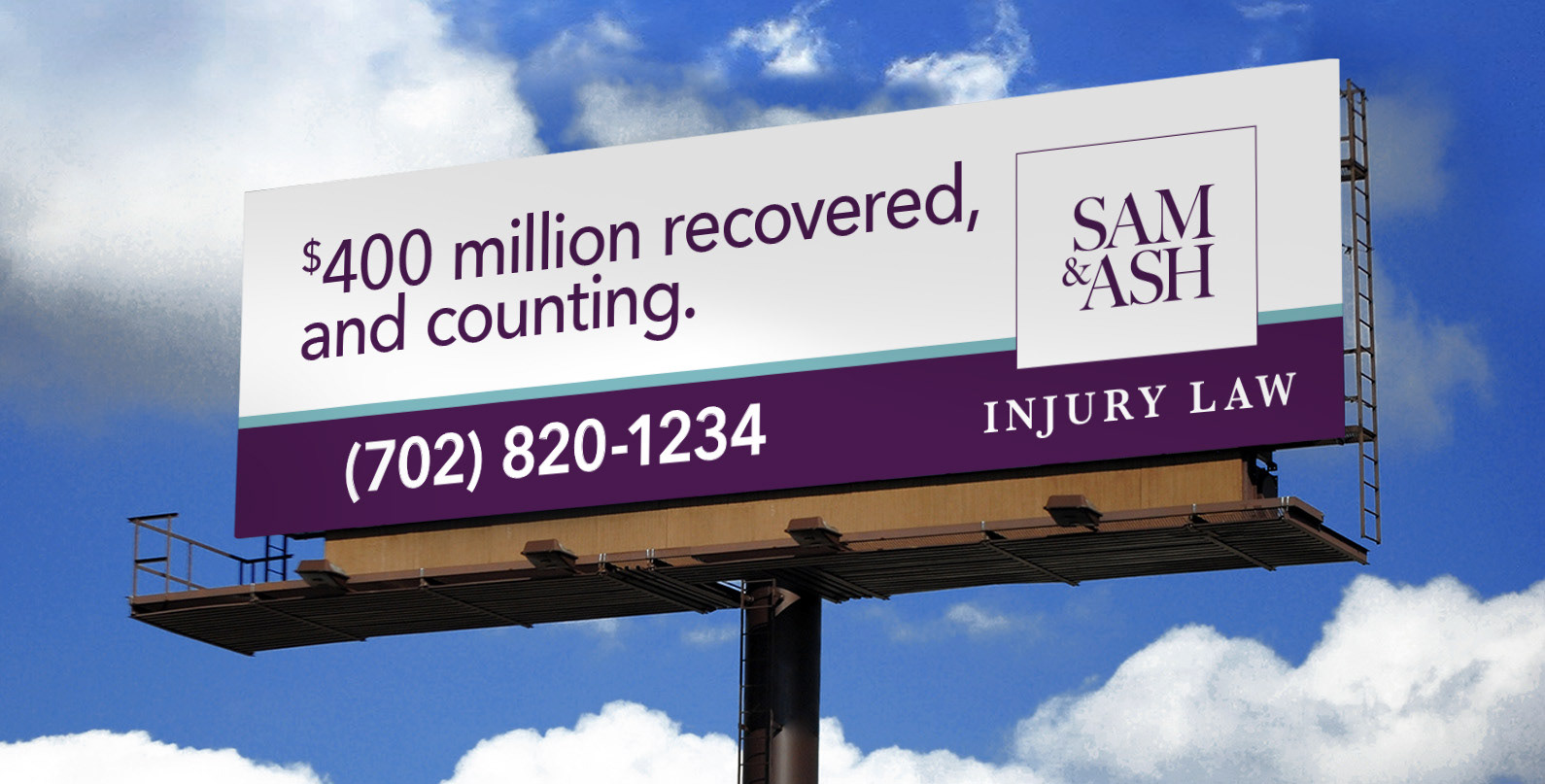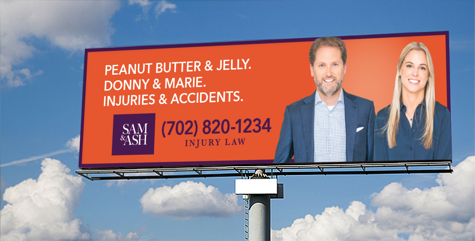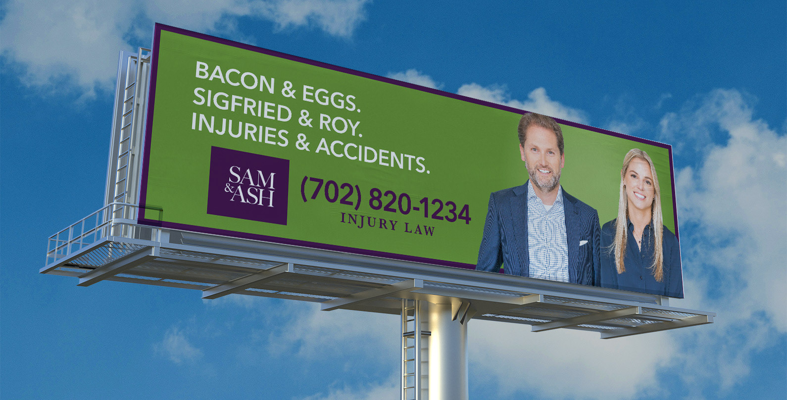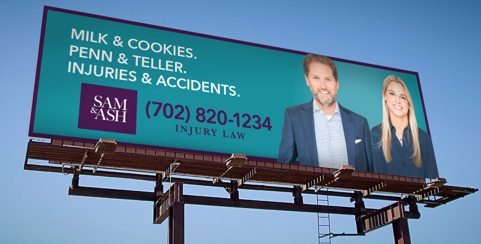 SAM & ASH is a personal injury law firm that specializes in helping people who have been hurt in accidents or incidents. With a hands on approach and a human touch in a category full of sharks, they are building a reputation of client first. To build awareness quickly, we worked closely with media planning to secure prime locations for outdoor boards and establish a presence on radio with on-air reads by local DJs and call-in shows. Playing off their name, Sam & Ash, the outdoor boards were created to tie into famous pairs, including famous Las Vegas pairs. They launched in Las Vegas during Spring of 2020 with TV, radio, OOH and radio talk shows with much fanfare.